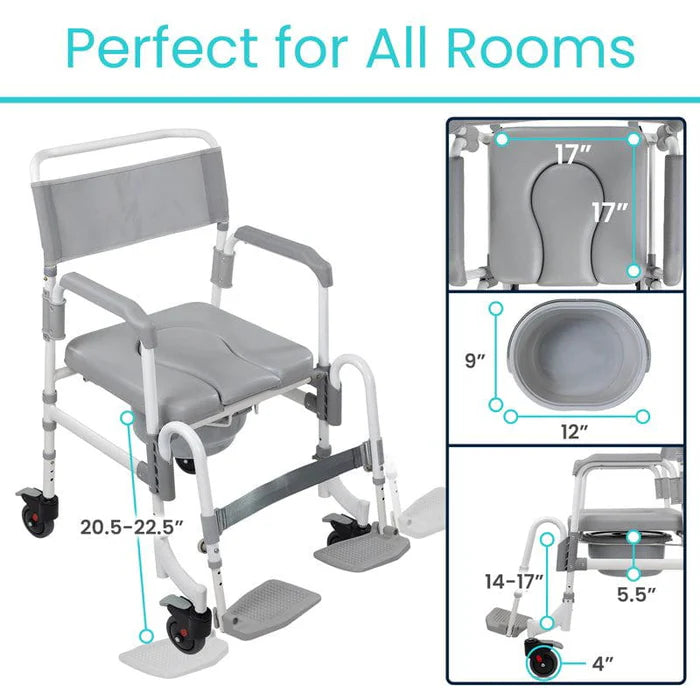 The Vive Shower Commode Transport Chair is a versatile 3-in-1 solution designed to serve as a shower chair, a commode, and a transport chair. This integration facilitates smooth transitions and enhances user independence in various caregiving environments.