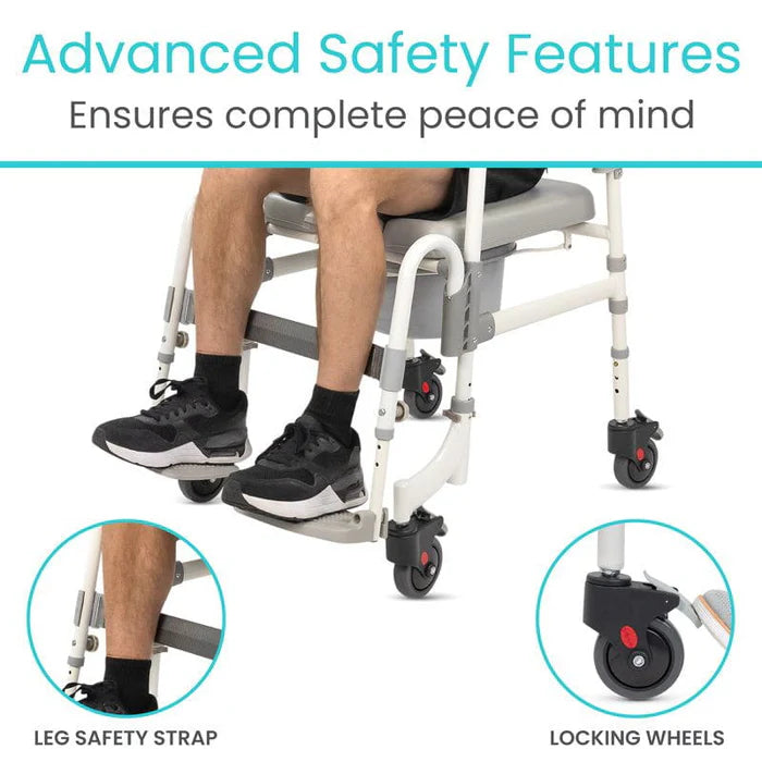 The Vive Shower Commode Transport Chair seamlessly integrates the functionalities of a shower chair, a commode, and a transport chair into a single efficient unit. This versatile chair simplifies mobility and care processes, significantly enhancing independence and comfort for users with mobility challenges