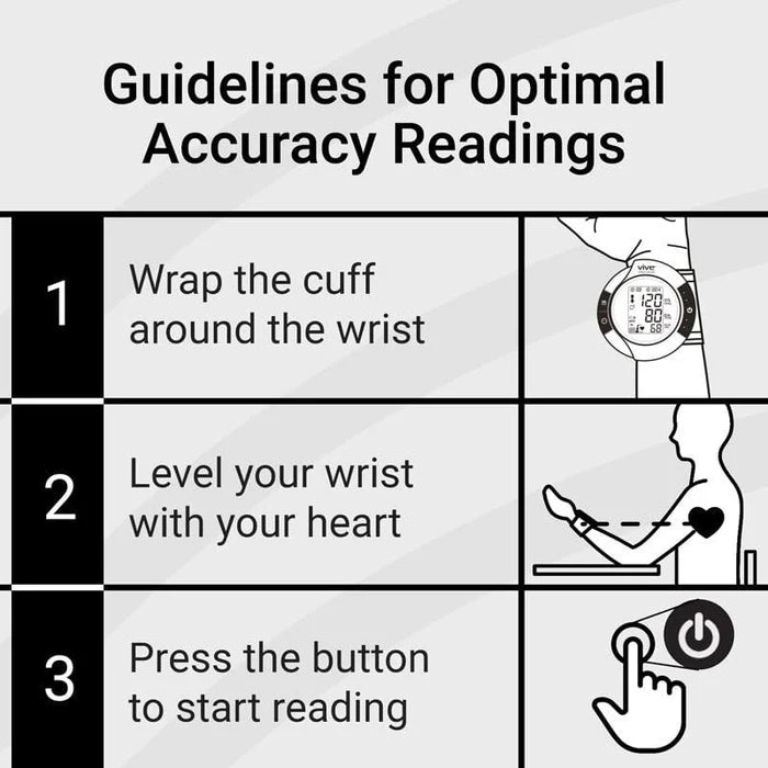 Press the power button once to automatically inflate the cuff and obtain accurate blood pressure and pulse readings on the Vive Precision Wrist Blood Pressure Monitor Model BT-V